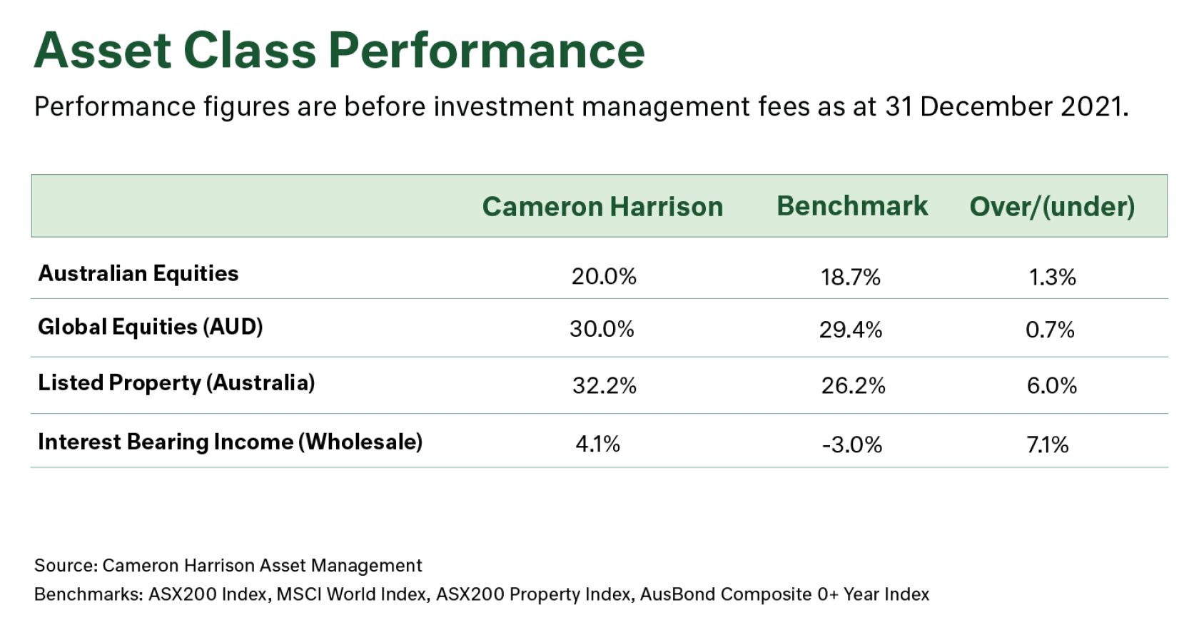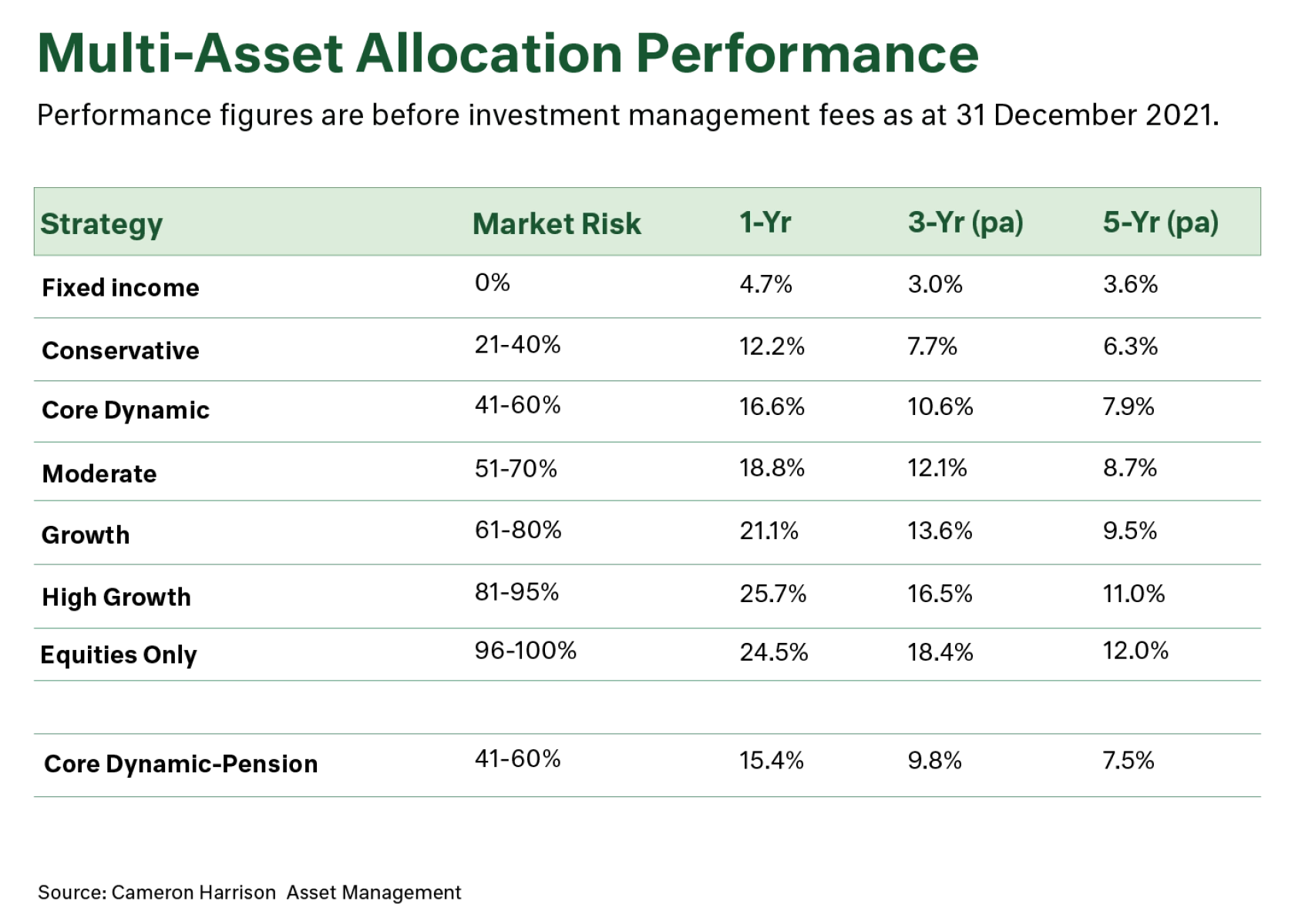 Cameron Harrison is pleased to provide a summary of investment performance for the year ending 31 December 2021. This covers both our multi-asset allocation strategies and individual asset class strategies. The results reflect strong performance across all investment timeframes from short-term (12 months) and long-term (3 years and 5 years).