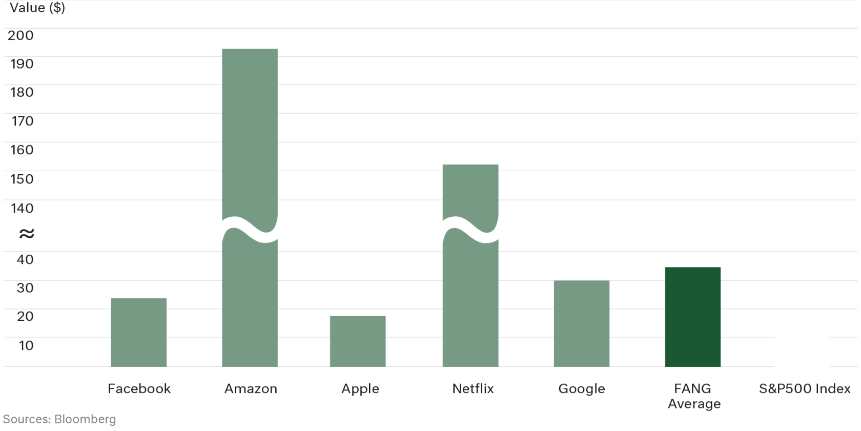 The FANG (Facebook, Amazon, Apple, Netflix, Google) cohort of companies are unquestionably (tech) powerhouses of our times. They trade on a forward weighted PE ratio of 36.9 times, compared to 20.8x for the broader S&P500 Index. The growth rates implied in this multiple assume 43% compounded EPS growth over the next 10-years – that assumes fairly straight line ‘plain sailing’. We like a lot of the FANG business strategies, it is just the valuation and future business performance assumptions we find difficult.