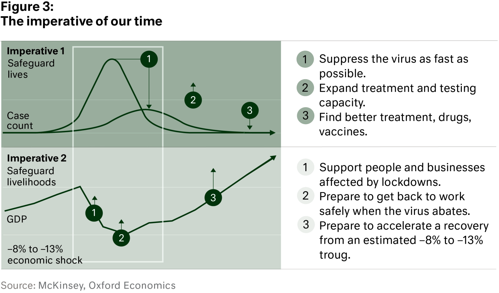 In Figure 3, we clearly see the trade off at hand for policy makers. Policy seeks to both safeguard lives and to safeguard the livelihoods of households. Other than Sweden, the world has largely adopted suppression (the lower curve in Imperative 1). The implication is that social distancing and the more extreme lock-down strategies rely on an eventual treatment or vaccine to materialise sooner rather than later, whilst government supports the economy with economic 'hibernation' policies which hopefully permit businesses to 'awake' - the assumptions being firstly, that businesses do not need to hibernate beyond 3 to 4 months, and secondly, that businesses can in fact survive for this period. The suppression approach also needs to fundamentally address the situation of no effective vaccine materialising.