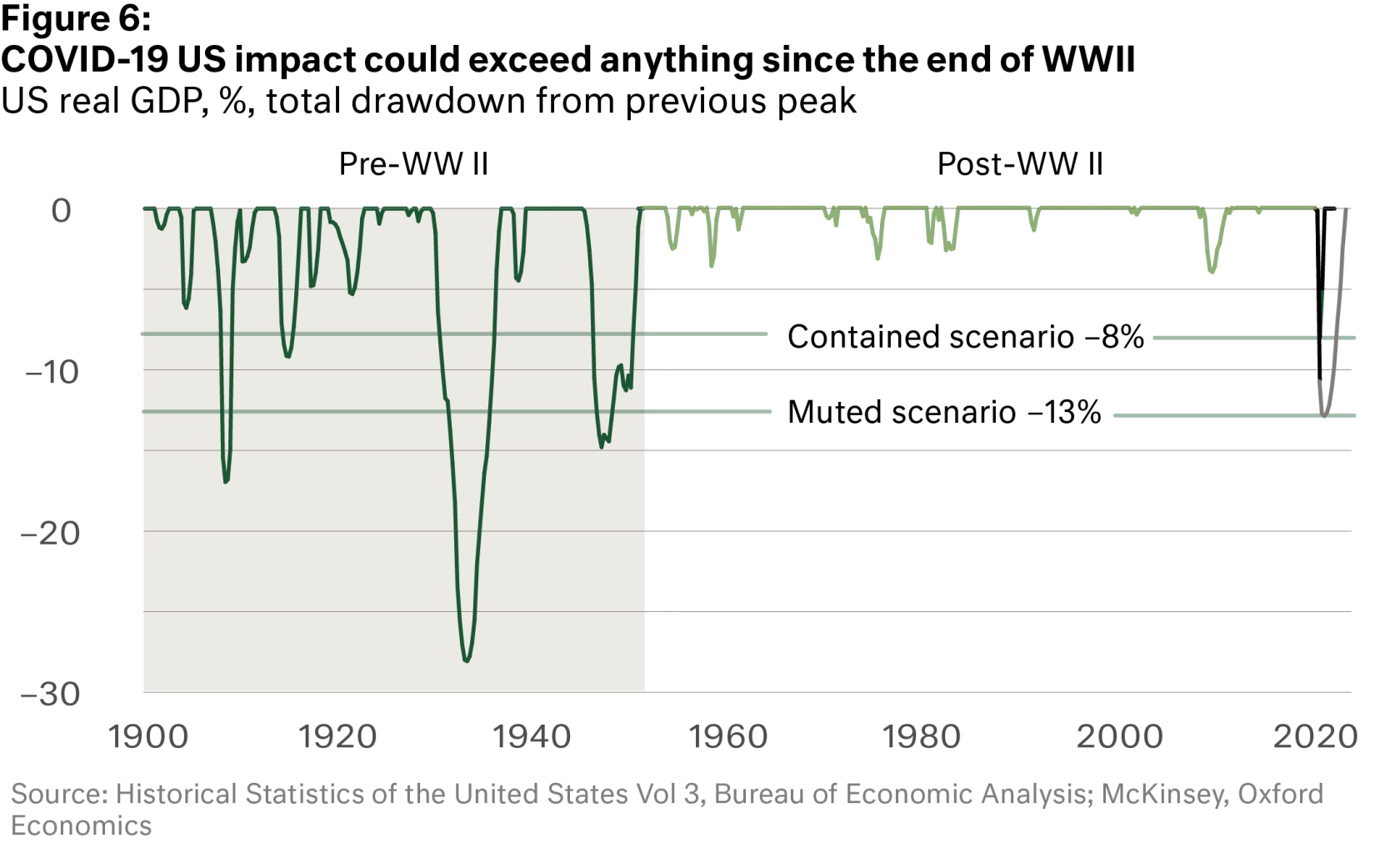 Another way to picture this and understand the scale of the two scenarios is seen in Figure 6 which considers US GDP drawdown from peak. Basically, the cost to GDP growth through growth reversal is equivalent to anything experienced since the end of World War 2 when the war machine suddenly halted.