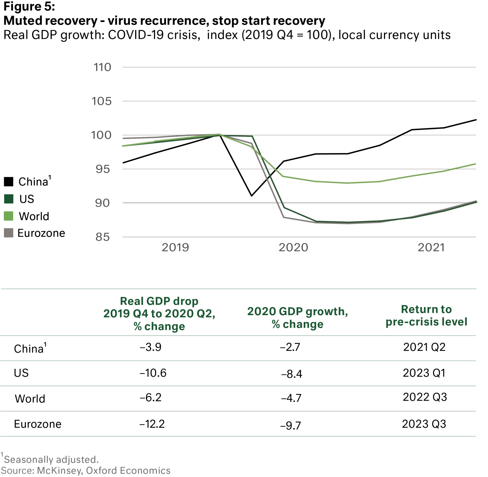 A more severe scenario is that pending an effective treatment and vaccine, that regions fail to contain the virus in a 3-month period and it spills over 6 months, with the high likelihood of recurrence and the need for strict social distancing to be continued. In this scenario, Europe and the US struggle for containment and China has recurrence. This is shown in Figure 5, and represents a starkly poor economic outlook with return to pre-crisis economic growth not till late 2022 or early 2023. In an environment of unknown unknowns, this probably reflects a more pessimistic outlook, but does serve to highlight the delicate policy balancing act between saving lives and saving livelihoods.