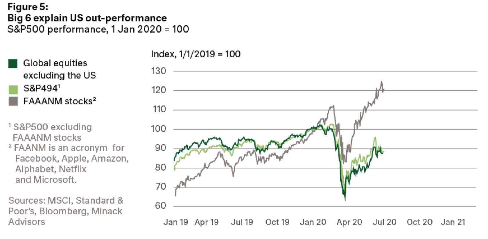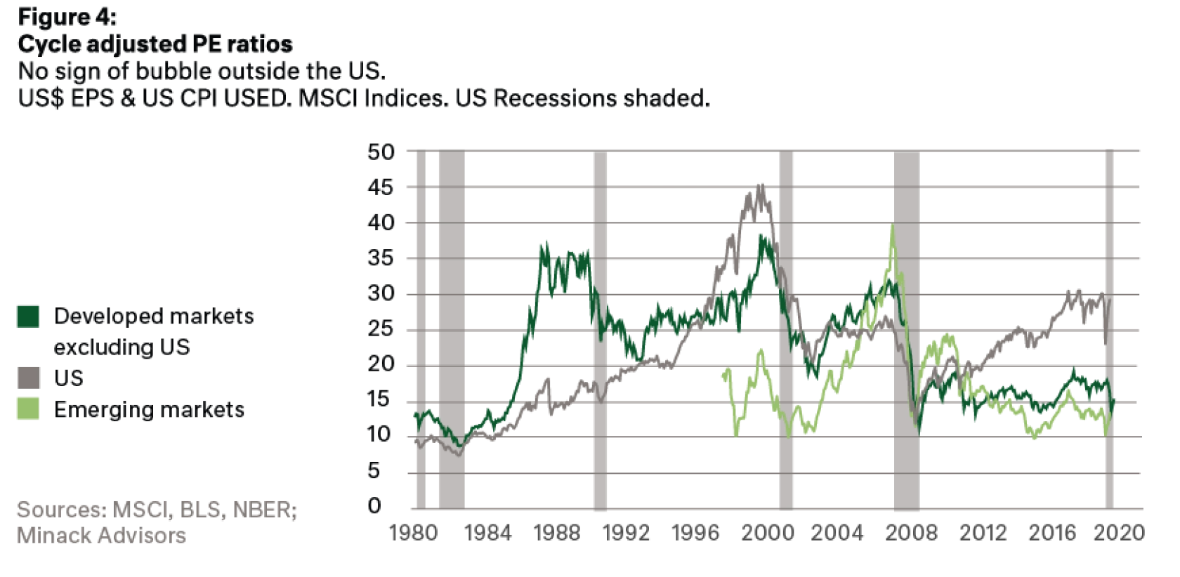 Here we see the dichotomy between the so-called FAAANM stocks which are represented by the grey line in Figure 5. The price performance and valuations are significant. In the light green line we see the S&P500 minus the six FAAANM stocks. Together with other developed economy equity markets the price performance for the broad US equity market ex the FAAANM’s is much the same as the rest of the world, and as we saw on the previously on Figure 4, valuations on a cycle adjusted basis quite reasonable.