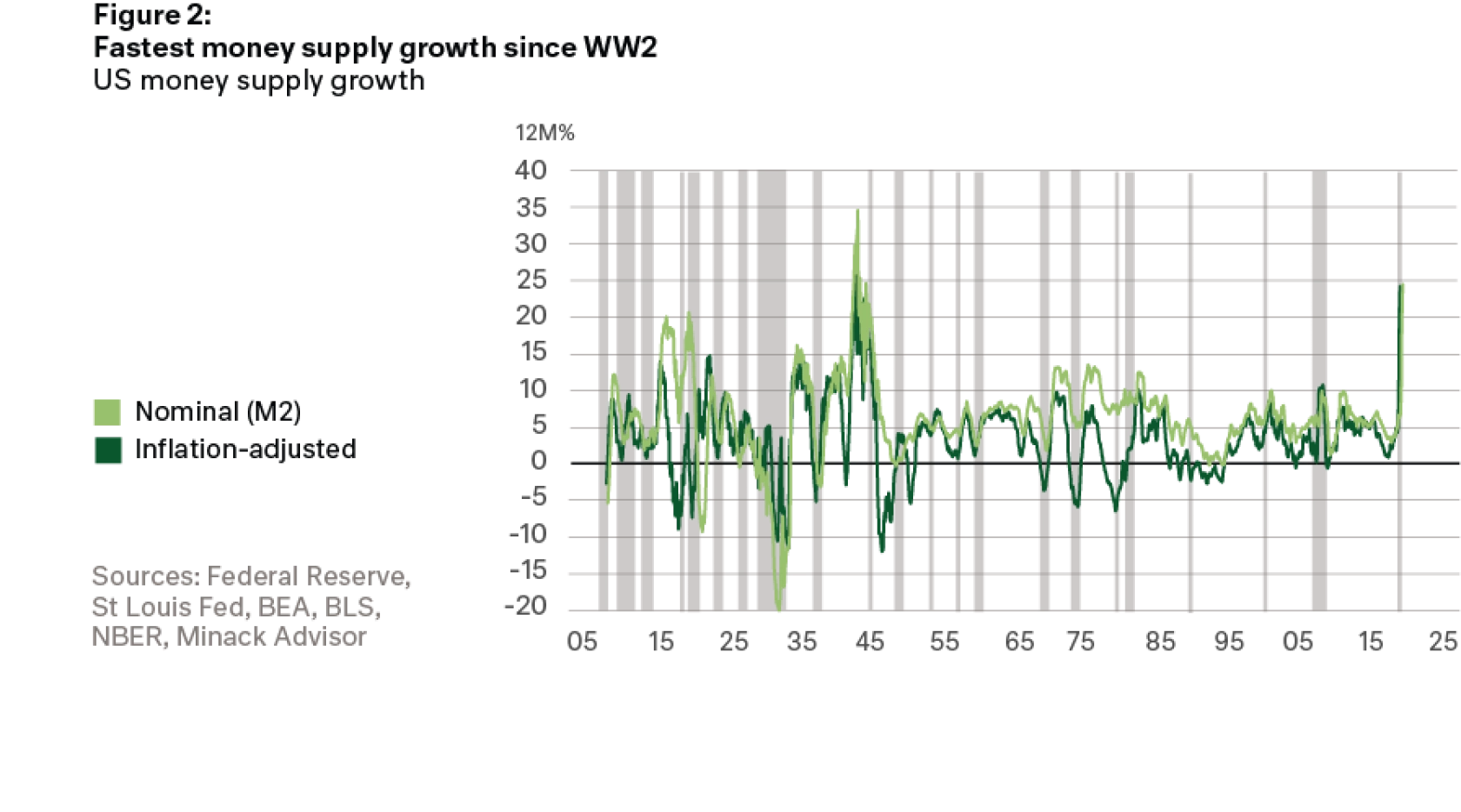 We can see in Figure 3 below, the dark green line the massive expansion in the US Government deficit from $1 trillion to $3 trillion. What is significant is that the Federal Reserve has expanded its balance sheet in a similar size, largely acquiring US Government Treasuries. We can see the Federal Reserve’s balance sheet expansion in the light green line in Figure 3.