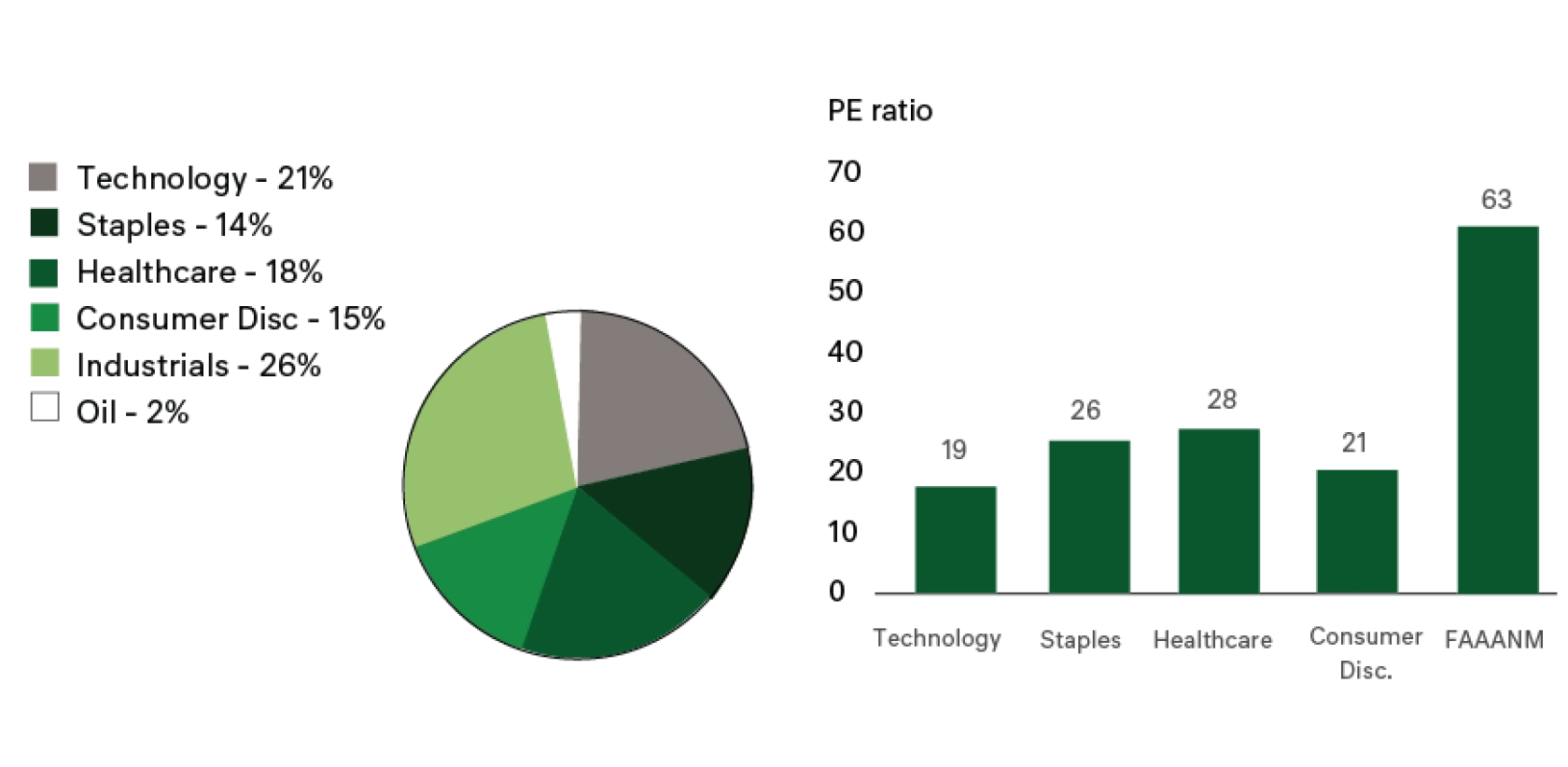 Within our US equity strategy, we are seeking to provide a diverse exposure to quality companies, often in industries that are underrepresented in Australia, or priced at a premium. As a result, the portfolio has no banks or mining companies. We are not looking to make thematic bets as demonstrated by the broadly even allocation across Technology, Staples, Healthcare, Consumer Discretionary and Industrials in the pie chart below.