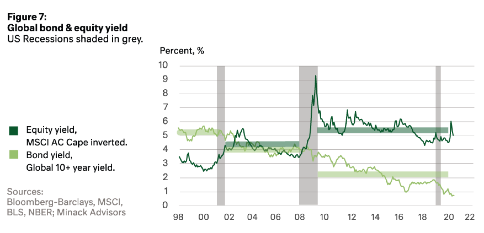 As Figure 7 demonstrates, we have the average equity market yield in the dark green and the bond yield in light green. We have seen the yield on bonds steadily fall from one cycle to the next as prices have risen. We do not see the same trend for global equities as a whole. The reason being, that the economic conditions that produce low rates are also seen as headwinds for corporate earnings.