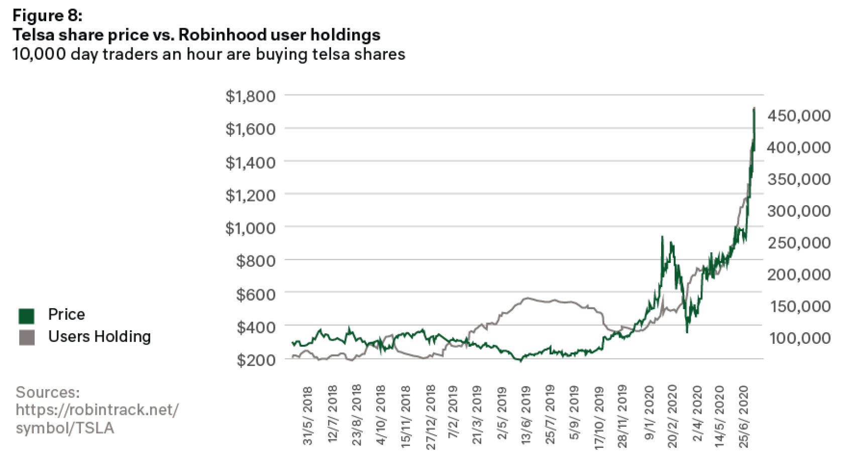 The company’s valuation is now greater than many large established car companies, including General Motors, Ford, Fiat Chrysler, Ferrari, Honda, Hyundai. Tesla is now worth more than those 6 companies combined. It is interesting when you overlay the trading in the company through Robinhood (grey line in Figure 8) with the share price (green line in Figure 8), you can see a striking correlation.