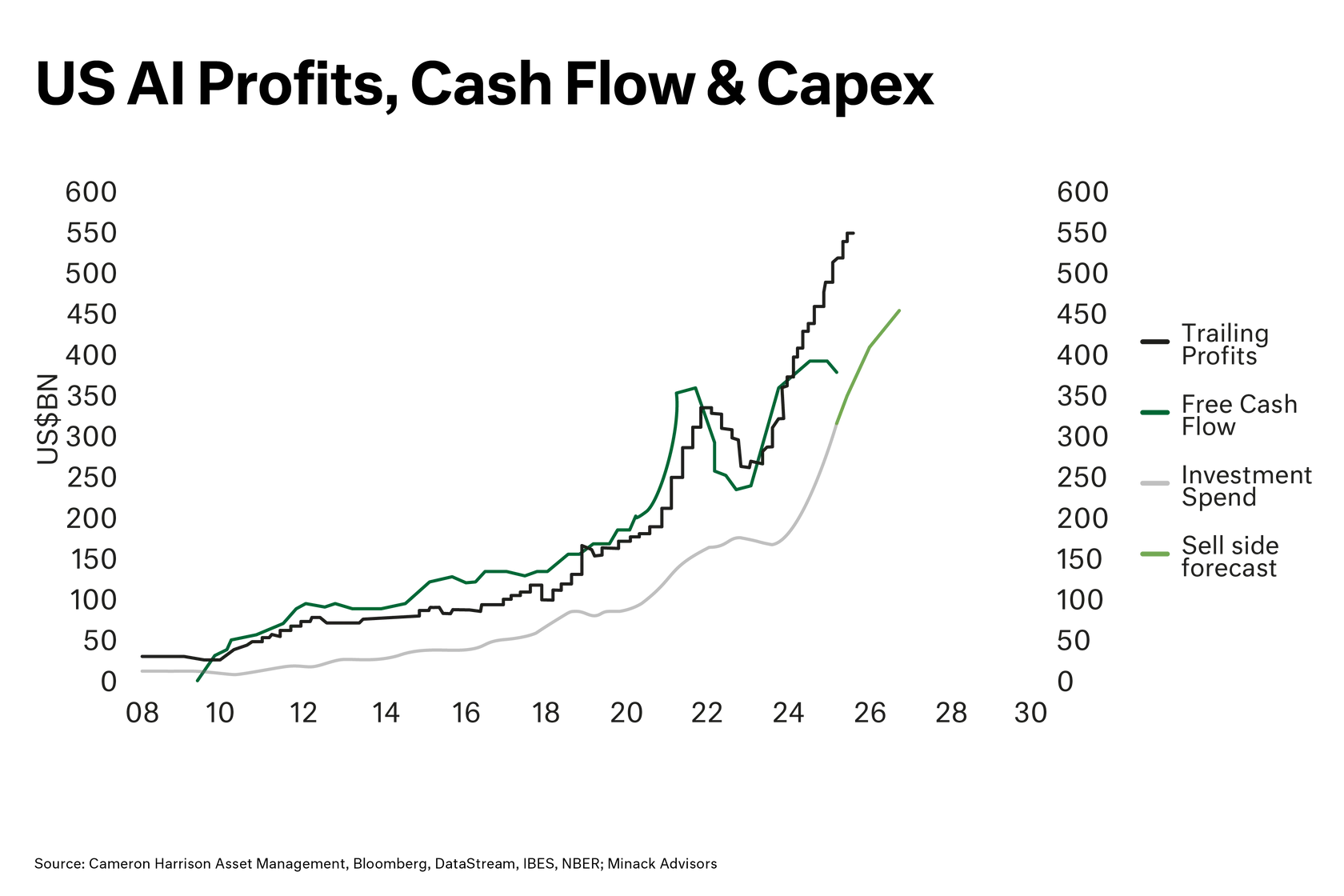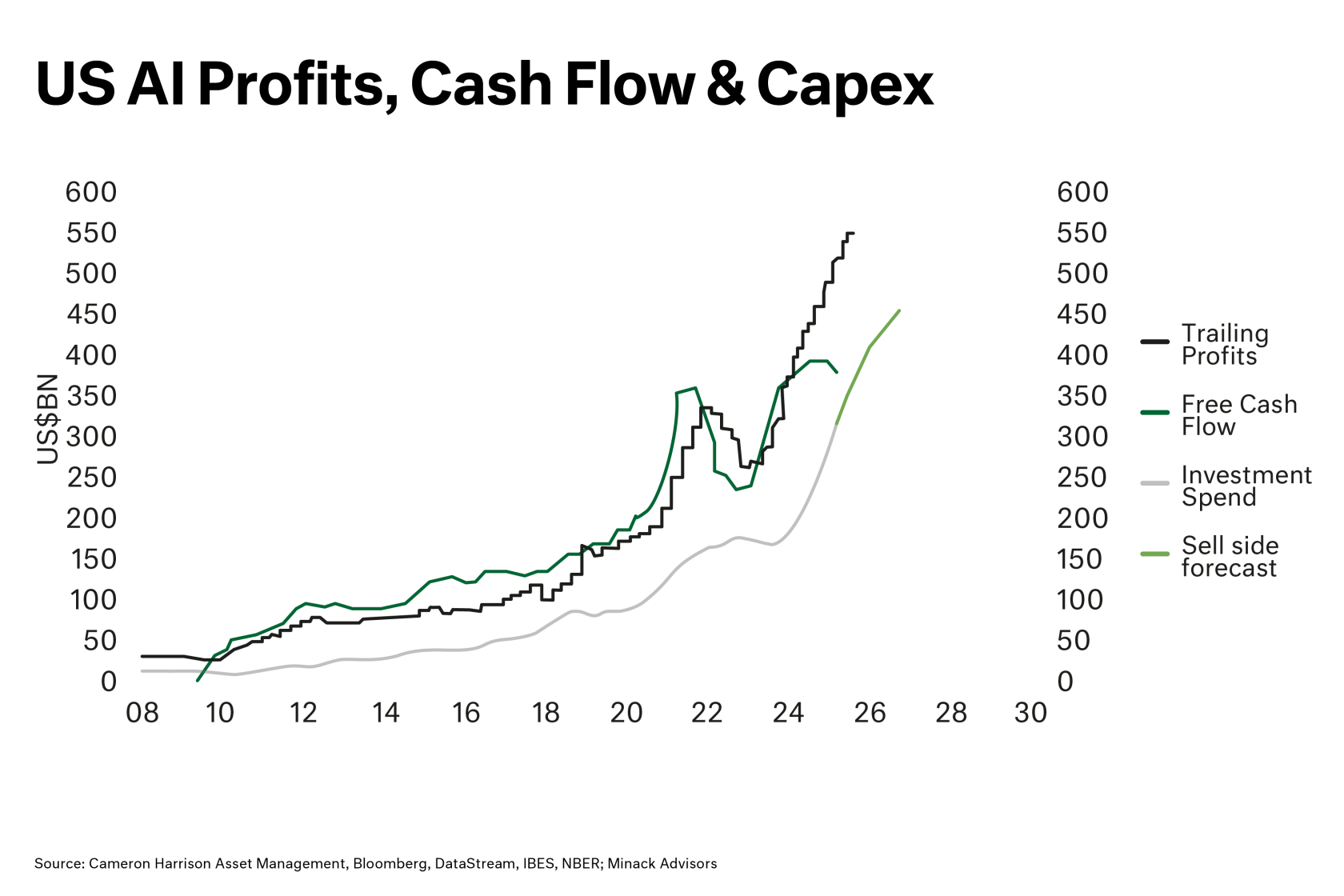 The analogies between the dot-com and telco bubble and today’s AI wave are striking. Valuations at record highs, a near-religious belief in technological transformation, and the promise of boundless future earnings have all been seen before. The parallels extend to the enormous capital intensity of this moment—massive investments into data centres, chips, and infrastructure—underpinned by an unquestioned conviction that AI will reshape every corner of the economy.