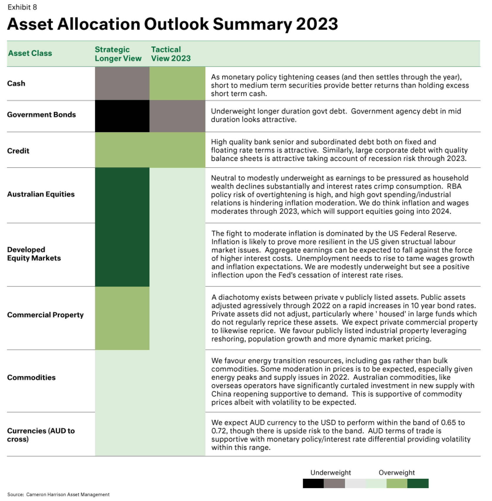 Our strategic (long term) and tactical (2023) asset allocation positioning is shown below. It shows our relative positioning which in turn, depending on your designated strategy, is reflected in an adjustment upwards or downwards.