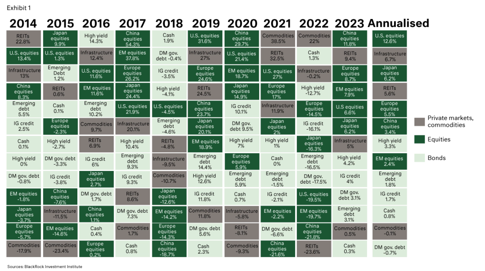 The performance of individual asset classes and by extension multi-asset class risk strategies in calendar year 2022 were uniformly the worst for nearly 15 years. This is illustrated in the heat map table below for the last ten years (exhibit 1). What this also illustrates is the significant variability of returns from one year to the next. Over a 10-year period, notwithstanding significant cross asset class performance variability, higher risk asset classes continue to perform better than bonds and cash. As we will discuss further on, a benign inflation environment has positively contributed to this outcome. Considered over 50 years, the asset class performance rankings are again quite similar, though the degree of outperformance of risk/growth assets is somewhat narrower, with bonds and cash producing acceptable returns.