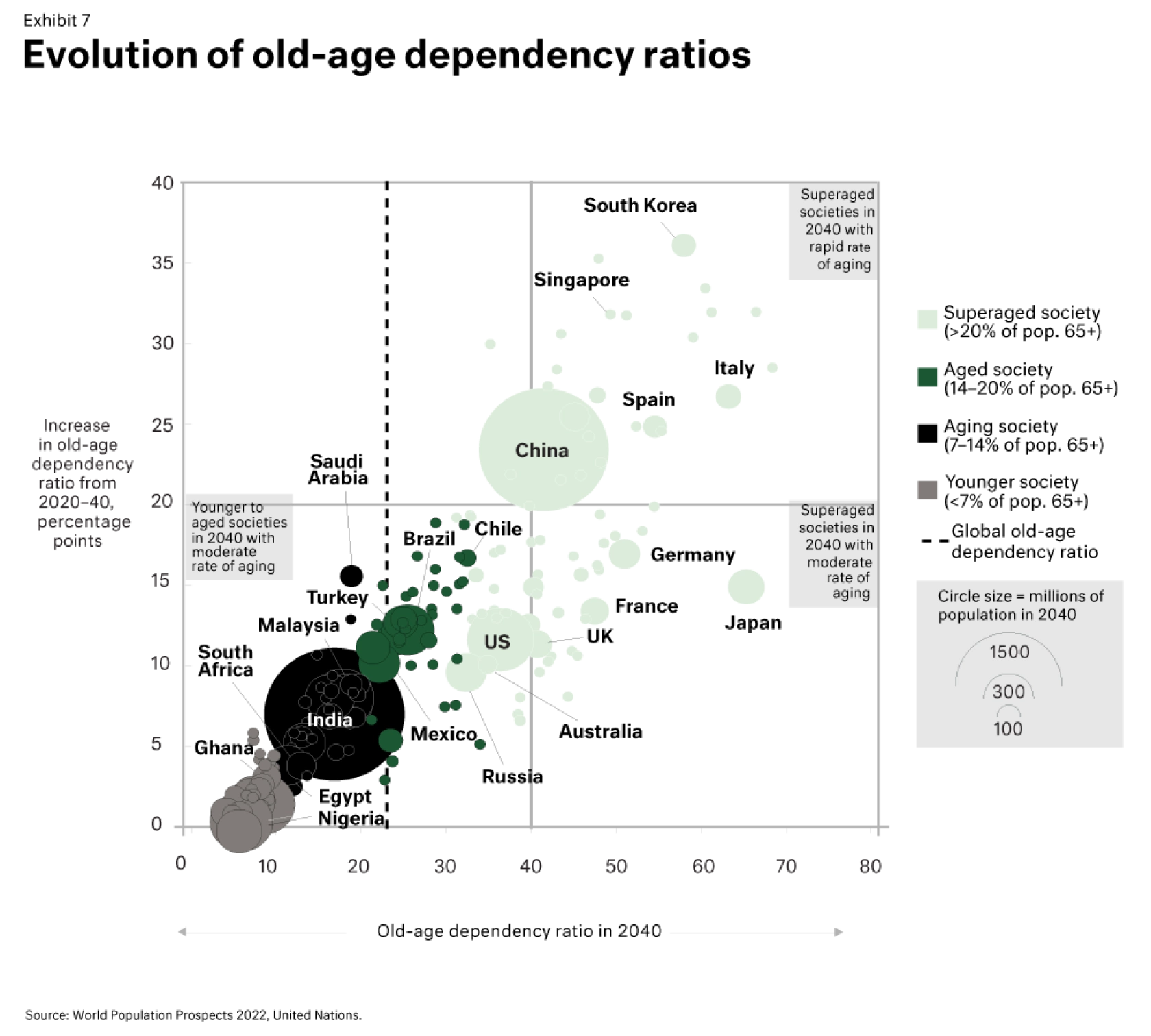 Geopolitical tension occasioned by the US and China’s ‘super-ageing’ compared with modest Indian and African continent ageing.