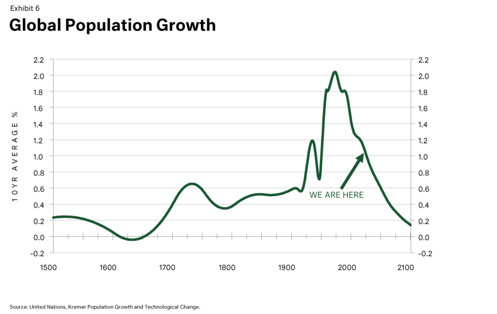 There is and will be a constant theme prevailing over asset allocation strategy for a very long time to come, and that is ageing. The rate of global population growth is in sharp decline (and has been for some time) and is expected to continue to do so (exhibit 5). When combined with an ageing population, this sees many leading economies become ‘super-aged’ where over 20% of their population is 65 years of age or more (exhibit 6).
