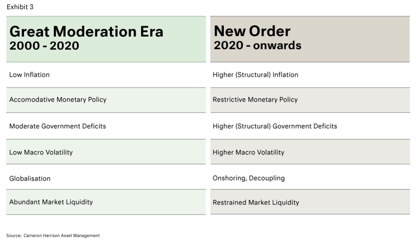 The economic and financial environment as we were (2000-2022), and now, how we see it looking going forward is outlined in exhibit 3. The go-forward position has the hallmarks of increased regulation, increased government involvement through policy discretion (social, energy transition, pricing in the market) and automatic involvements (ageing: health & pension). This risks an environment of more rigidity, less efficient capital allocation, lower productivity, lower real growth and higher unemployment and inflation. A key point we note is the need for asset allocation to be dynamic in its approach. In this regard, we have been operating our Core Dynamic Multi Asset Allocation Strategy since 1993.