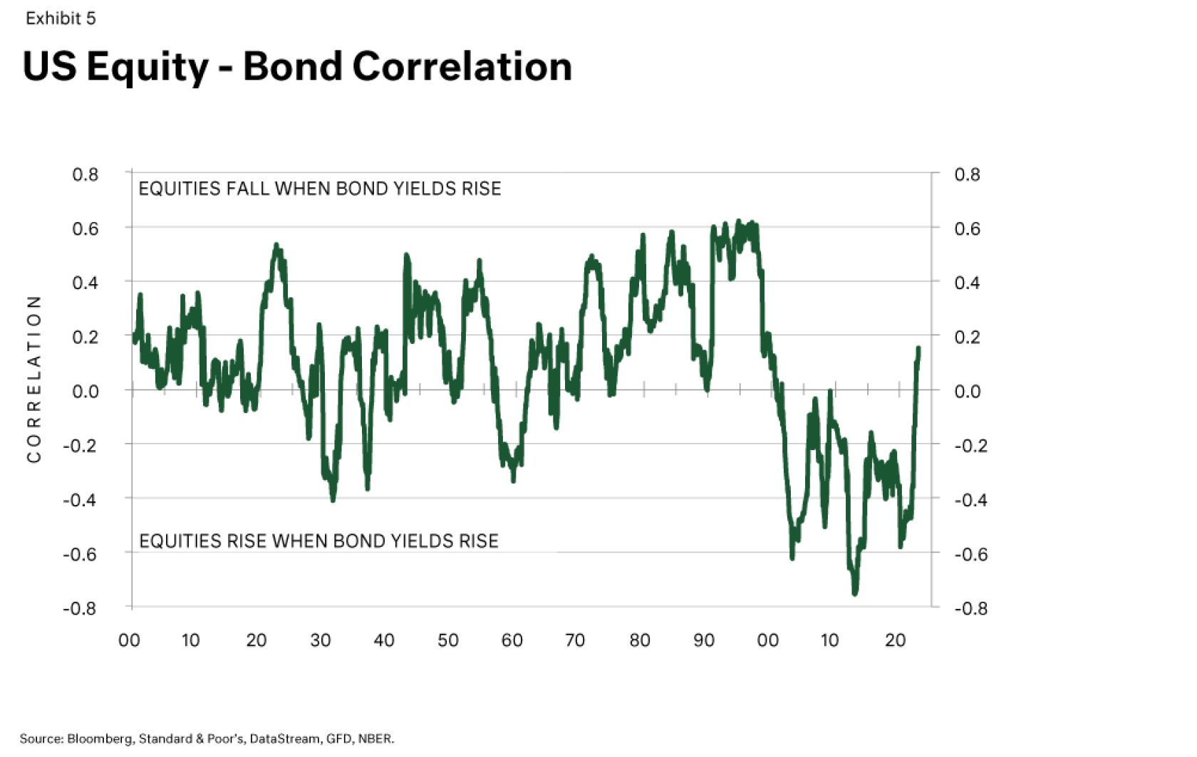 The returns for asset class in 2022 reflect positive correlation – that is, as equities performed poorly as a risk asset, so too did a portfolio of government bonds. This meant both equities and bonds were positively correlated. This is out of character for the last 20 years where the relationship has been one of more negative correlation (exhibit 2). What this meant is that when equities declined, bonds tended to perform better – bonds were a hedge to equity volatility and supported diversified returns. This has not always been the case. If we go back to the period from 1967 up to 1999, this relationship was broadly positively correlated.