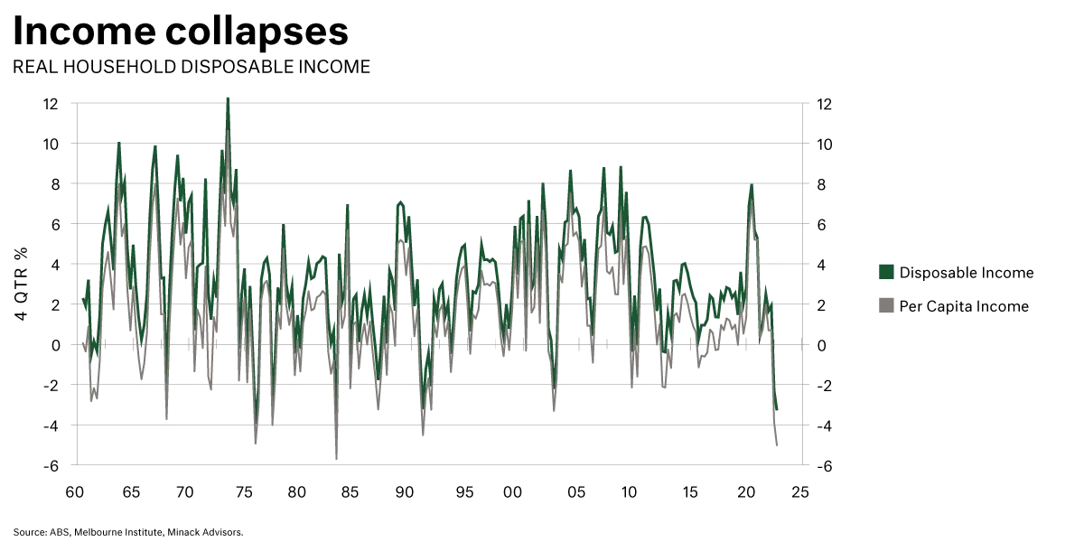 Households have just experienced their train suddenly going from 200 km/hr to 40 km/hr, and they are in awful shape. The household is facing a historic lowering in real household disposable income. We can see this in the graph below in the dark green line. Bad enough on an aggregate level, but the significant point we want to make, is on a per capita basis it is a real crisis – a recession. We see per capita real disposable income as negative growth in light grey, and it is at historically low levels when compared with the last 45 years. This is important for Australia in particular because as we will see shortly, the extent of real per capita disposable income is being driven by net migration, which will act as a medium to long-term suppressant of income growth.