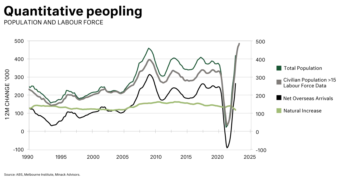 In our next graph we starkly see the extent of resurgent population growth. In particular, the stunning growth reversal in the working population greater than 15 years of age, shown in the grey line, is approaching 500,000 additions over the last 12 months. This directly relates to the labour force.