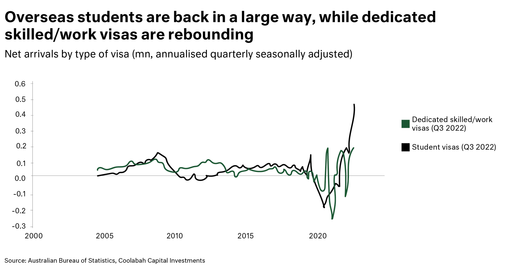 So, in summary we view the RBA's recent slowing in rate increase from 50 basis points to 25 points as perhaps a tacit acknowledgement that the lag effects of policy will be observed before policy moves beyond a 3.1% cash rate (already highly restrictive). Immigration/visa data is a major factor that the RBA will need to calibrate into its policy settings. Pre-COVID, it concerned us that the RBA was extremely poor at reading & interpreting population growth data and the effect on wages growth and inflation. A failure to read this data correctly or simply to ignore it would likely see rates continue to rise well beyond a sensible level of restriction, and therein is the major risk. Will the RBA just take monetary policy on, in an inflation busting ideology, with a ‘damn the consequences’ outcome? In the US, we think this may be necessary, but it is not the case in Australia. The potential problem is the RBA is once bitten, twice shy. Having been heavily criticised for their policy setting well before and through COVID, they will simply seek to crush inflation and with it create a deep recession in Australia (as a self-validating necessary cost). This attitude draws from current US Federal Reserve rhetoric, but as we have noted, the circumstances in Australia are quite different to the US. We certainly hope the RBA can operate restrictive policy effectively and discriminate the differences.