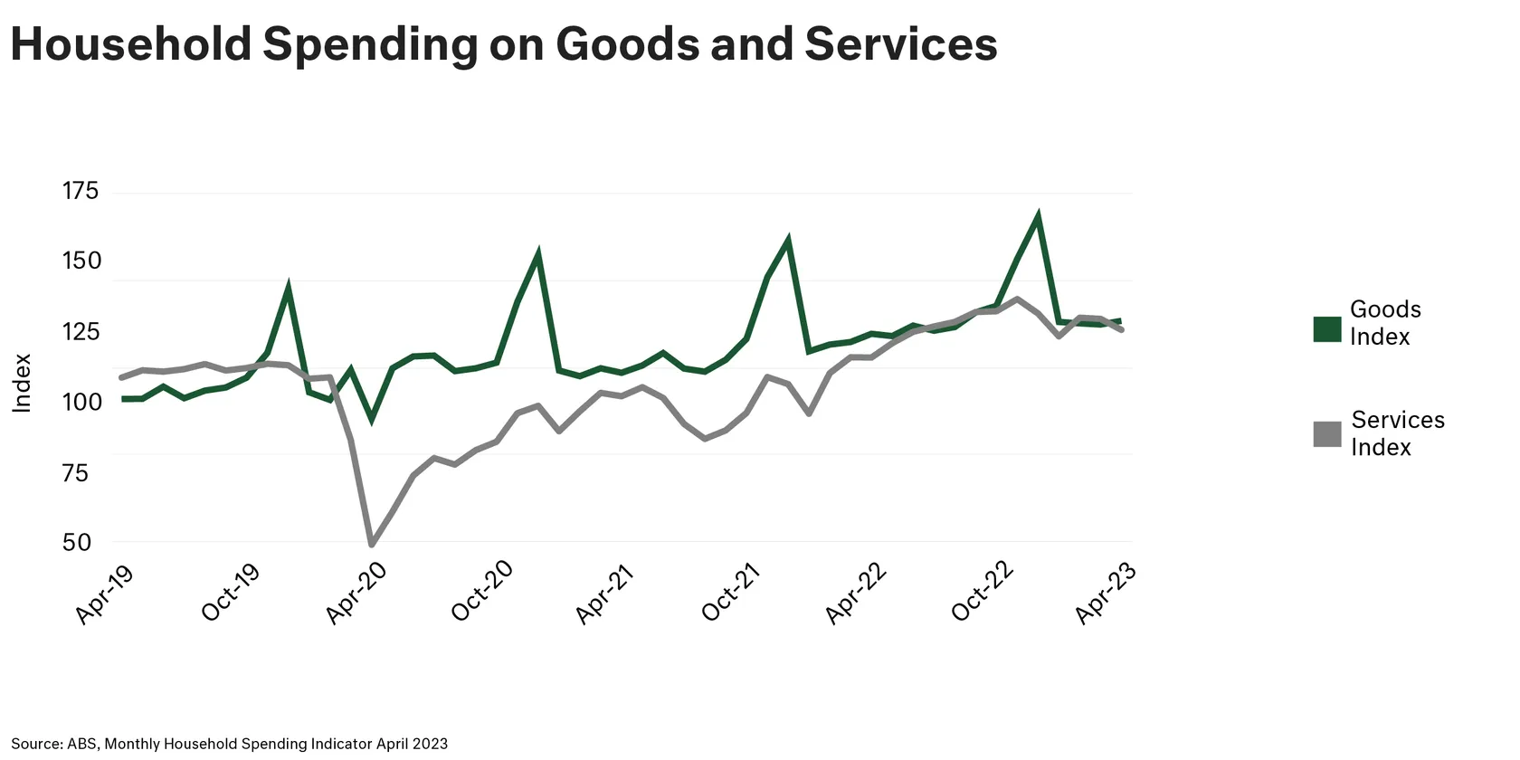 The seismic impact of Covid on the consumer spending split between Goods and Services dissipated by the end of 2022 and we are now seeing a downward trend in spending on both, despite the highest levels of immigration in Australian history. This points to a broadening of financial discomfort across the economy as higher housing costs (mortgages and rents) start to bite.