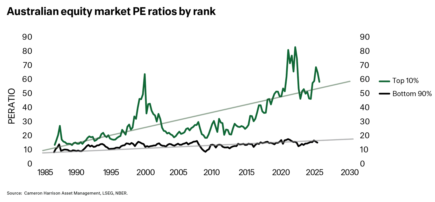 The rise in valuations has been relatively narrow, with the most expensive 10% of the market becoming more and more expensive (see chart above), to levels rivalling valuations prior to the dotcom bubble, and the 2022 inflation selloff.