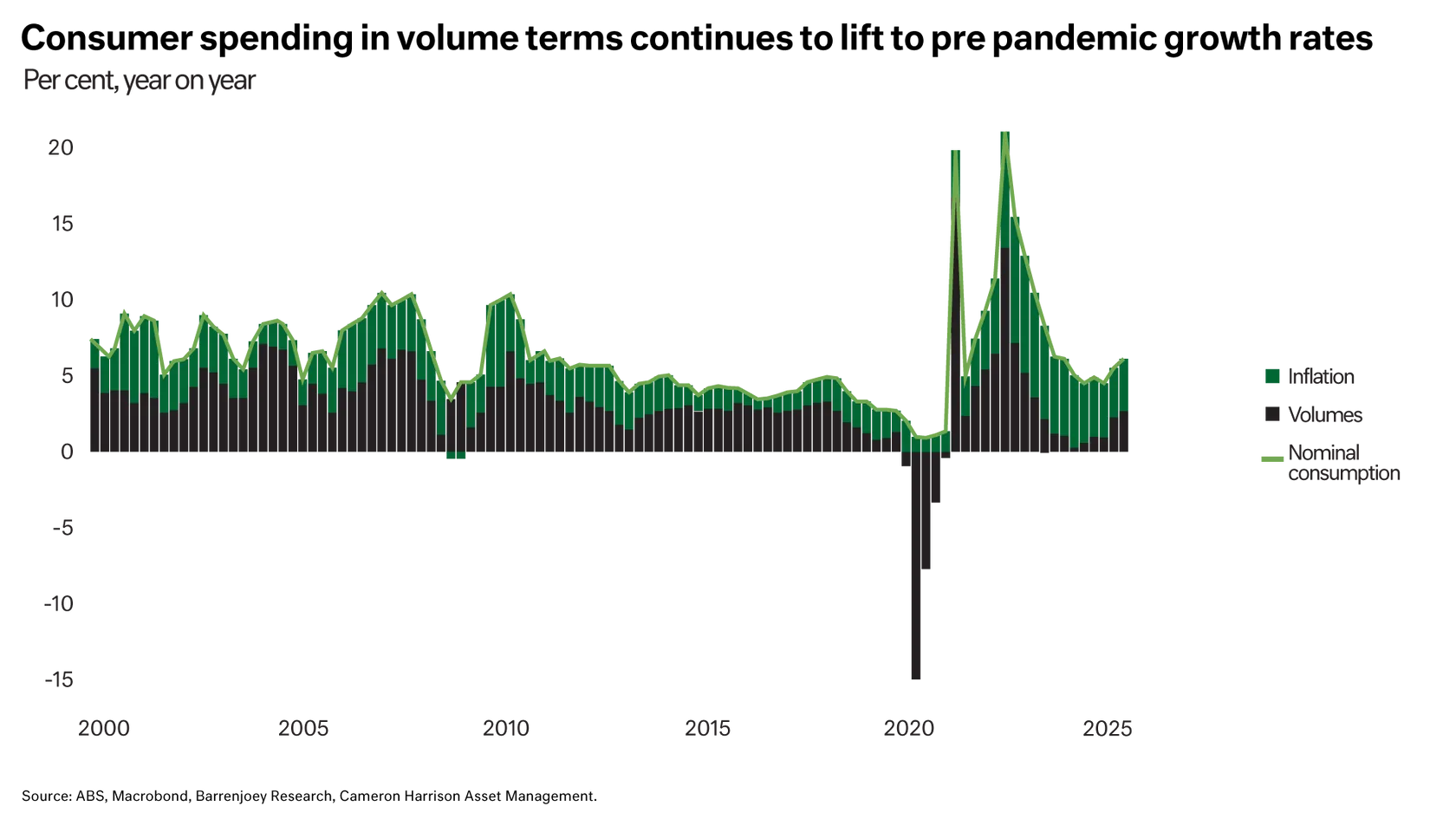 The consumer led the way in 2025. Three rate cuts from the RBA alleviated pressures, and solid wage growth saw rising disposable incomes (albeit from a low base) which boosted consumer confidence. These factors alongside a positive housing market (that added the wealth effect into the mix) resulted in a happier consumer. This saw the consumer spending volumes return after a period where real consumer spending (after inflation) has been declining. It was the first time in years consumers were buying more – not just paying more for the same level of goods.