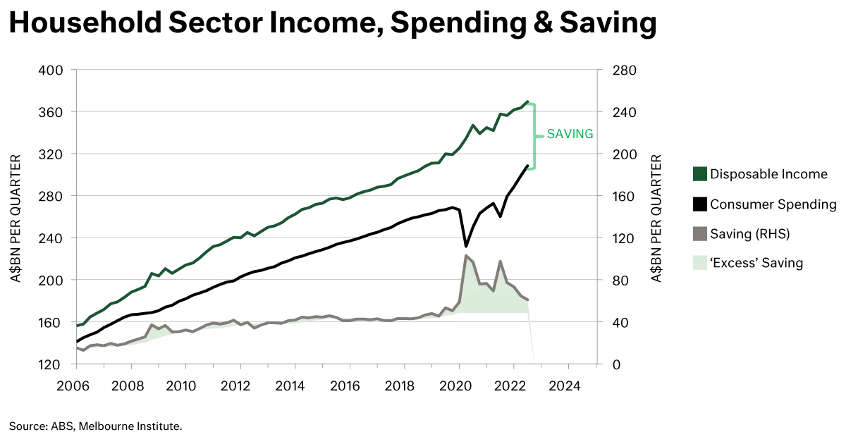 Even before the lagged impact of mortgage rate increases has taken effect, we can see below that the bounce back in real spending from COVID has been funded by savings drawdown. The combination of savings drawdown and negative real wages growth in combination is a drag on activity and illustrates households’ spending rates are approaching a decline as savings are dissipated. This is important to moderating Domestic Final Demand which was running at 6.9% for the 12 months to 30 September 2022.