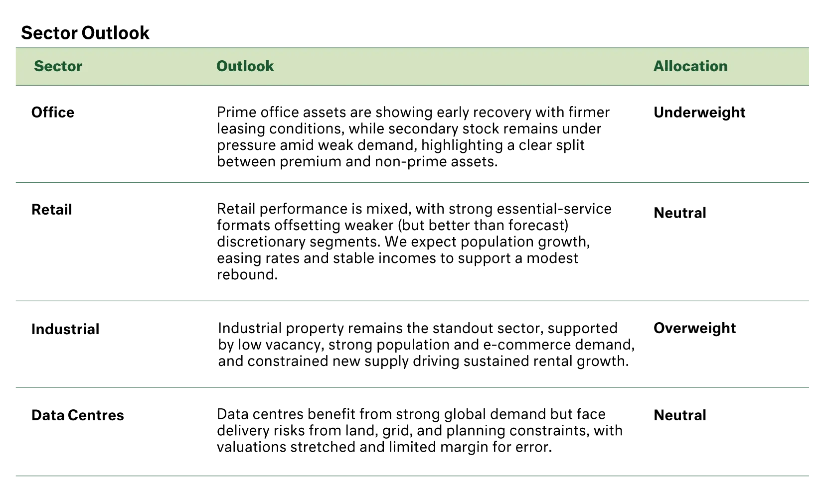 Within this environment, we expect industrial, logistics, and essential-services property to deliver the most resilient, inflation-protected cash flows and outperform through the cycle. Data centres, while structurally attractive, remain priced for perfection and carry execution risk. Offices and retail will improve selectively, prime CBD assets and essential retail formats should stabilise – but structural challenges persist. Our positioning reflects this conviction: overweight industrial and healthcare, underweight office and discretionary retail, aligned with a house view that favours scarcity-driven sectors with strong fundamentals.