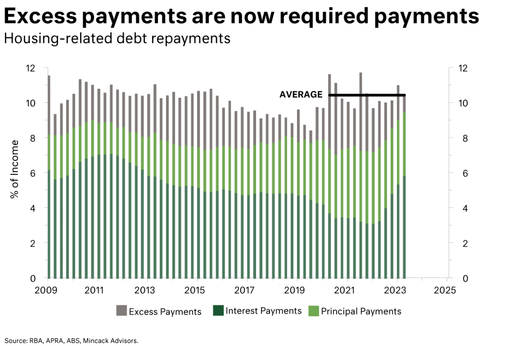 These savings were used by many mortgage holders to make additional or excess payments on their debt, totalling an equivalent to 9.5% of income (see grey bars on chart). This was a sound financial strategy.