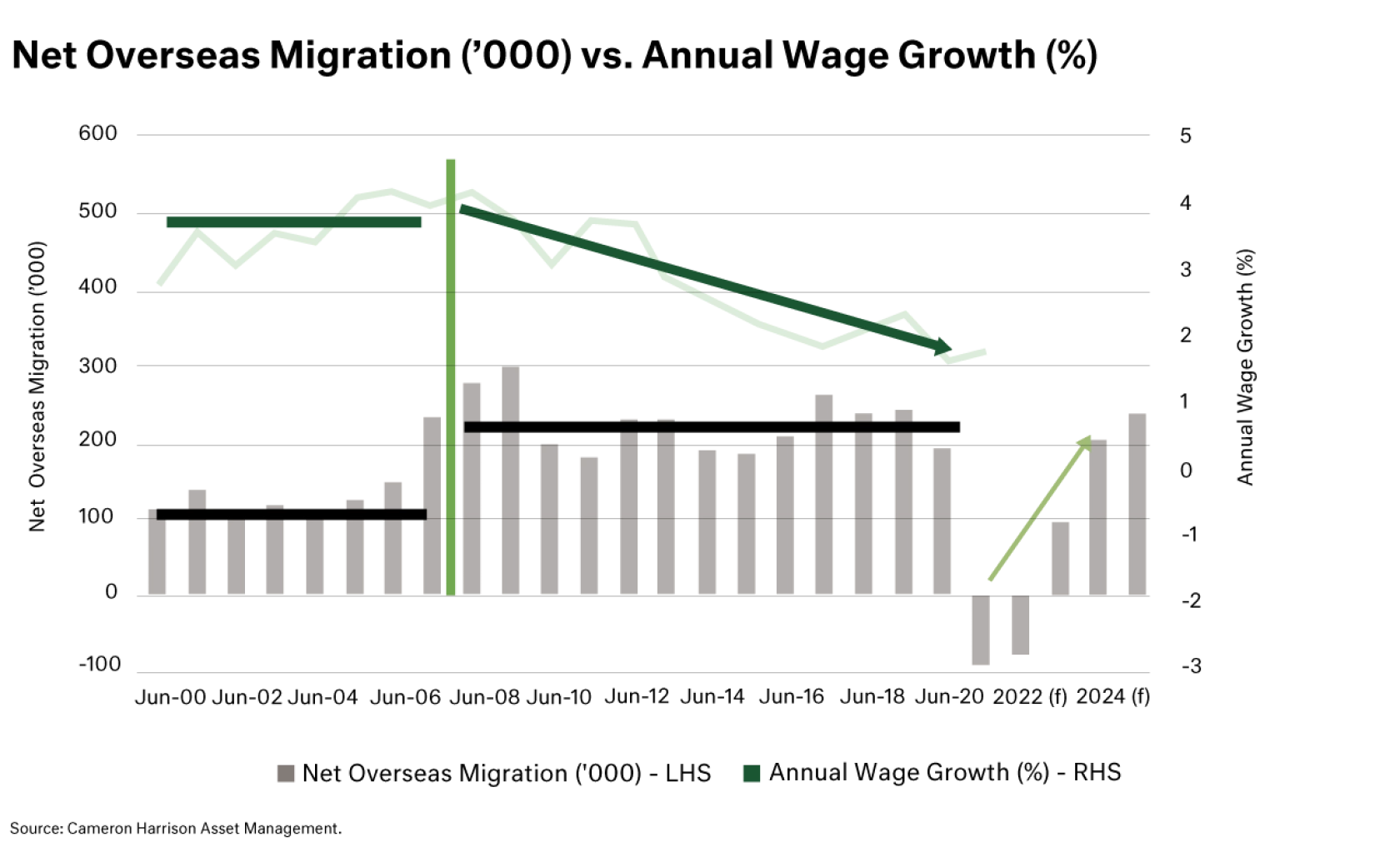 The slight uptick in wages that has occurred, and any increase that will follow, has been driven by the reduction in labour supply, with negative net migration over 2020 and 2021.