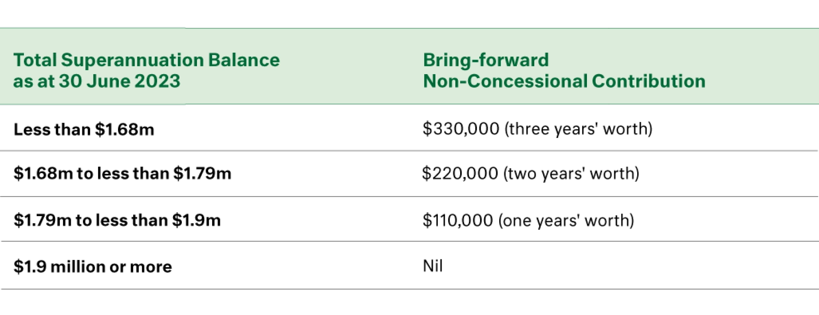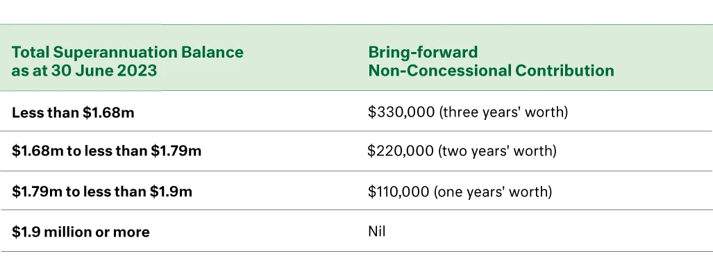 Now, those with TSBs under $1.68 million on 30 June 2023 can 'bring-forward' three years' worth of Non-Concessional Contributions, adding up to $330,000 to their superannuation this financial year – being $110,000 as this year’s annual contribution (FY24), plus $220,000 for the next two financial years (FY25 and FY26). Those with TSBs somewhere in between $1.68 million and the $1.9 million TSB cap have slightly lower bring-forward allowances: