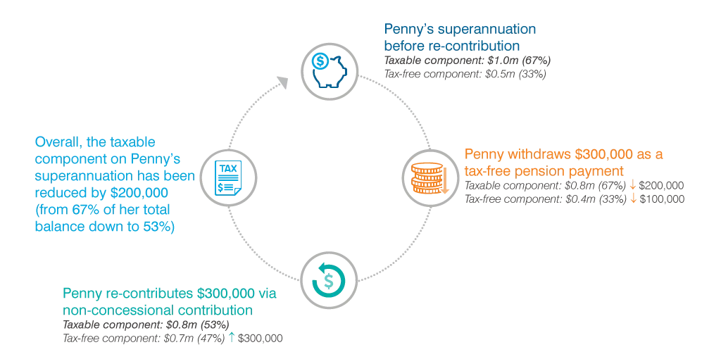 On a net basis, the re-contribution will have the effect of reducing Penny’s taxable component by $200,000 or 53% of her total balance (down from 67%), as illustrated below: