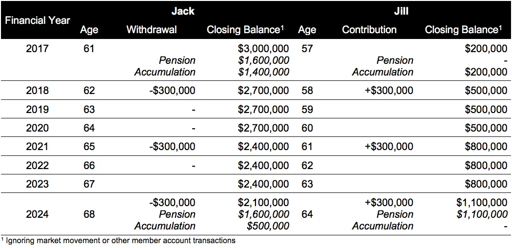 Jack could withdraw part of his $1.4 million accumulation balance (tax-free as he is above the age of 60 years), gift the funds to Jill who could then contribute the monies to her account through non-concessional contributions.