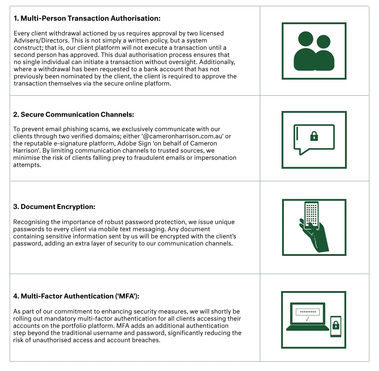 Protecting oneself from scams requires vigilance (more likely, a high level of scepticism) and proactive measures, such as staying informed about common scam tactics, verifying investment opportunities, and exercising caution online. As a financial services provider, we believe it is also our responsibility to employ dynamic and robust measures, and educate clients on these risks. At Cameron Harrison, we prioritise the safeguarding our clients' finances and have implemented stringent protocols to mitigate the risk of fraud.