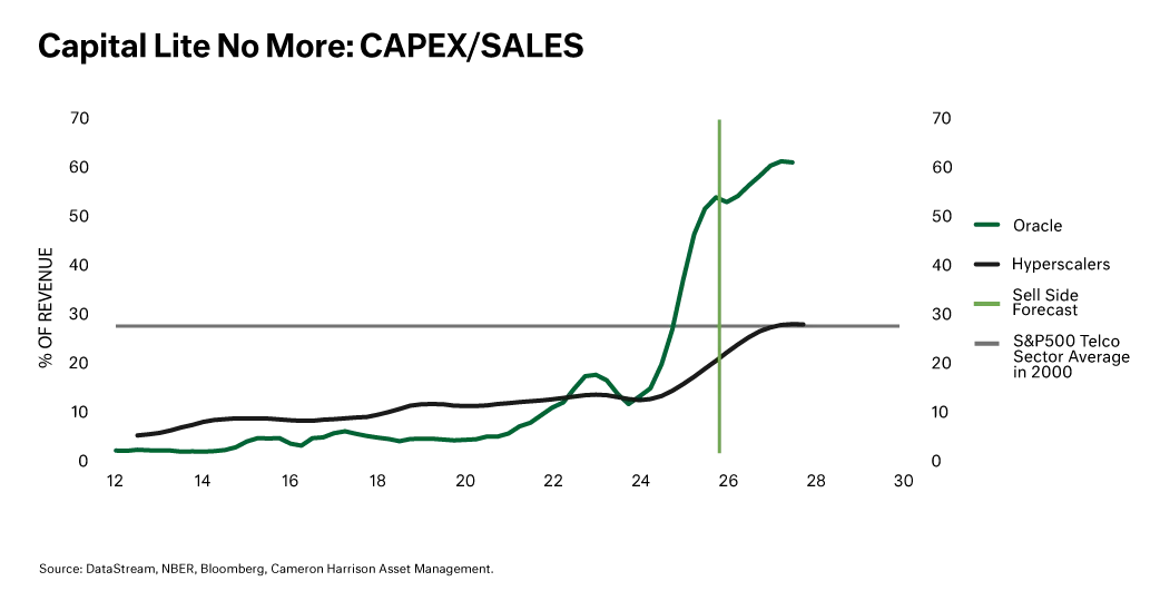 The chart below, shows hyperscaler capex surging toward 25 percent of revenue, levels once associated with ‘old-world’ telecommunication networks.