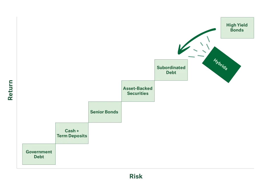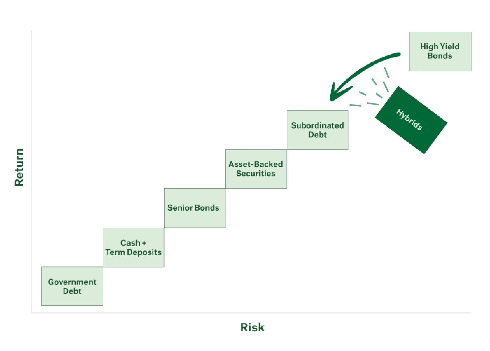 Hybrids (AT1 capital) are designed to enhance the stability and resilience of banks. It acts as a buffer to absorb losses when a bank’s equity capital falls below a certain threshold. The name ‘Hybrid’ stems from the ability for this capital to convert into equity in times of stress when the equity of a bank falls below a threshold (5.125% for Australian banks). This ‘tops up’ a bank’s equity to protect deposit holders. Below is a simple look at a bank’s capital structure.