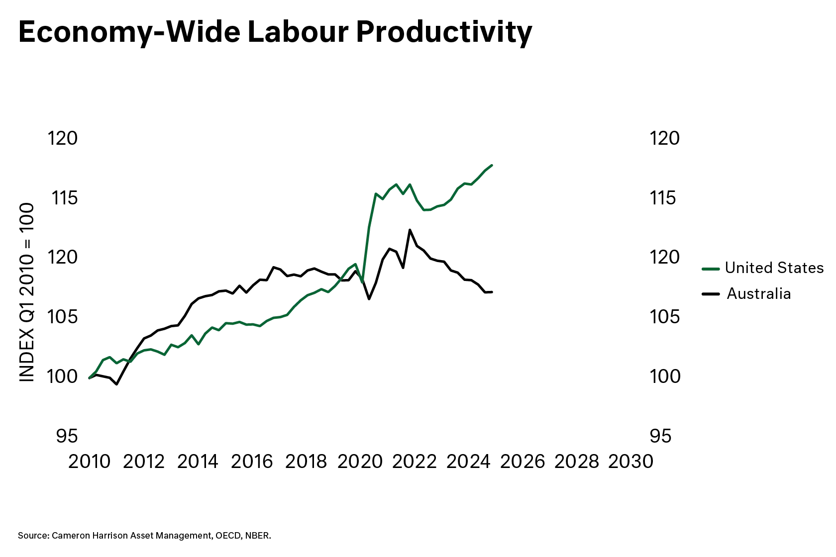 Australia appears to be slipping back into the post-GFC, pre-COVID growth model – one marked by flat real wages, declining productivity, and reliance on population growth to drive headline GDP. Australian real wages are 4.8% lower than before the pandemic, compared with most developed peers that have managed gains, and real household disposable income per capita has fallen by 8% over the past two years, the worst outcome across the OECD.