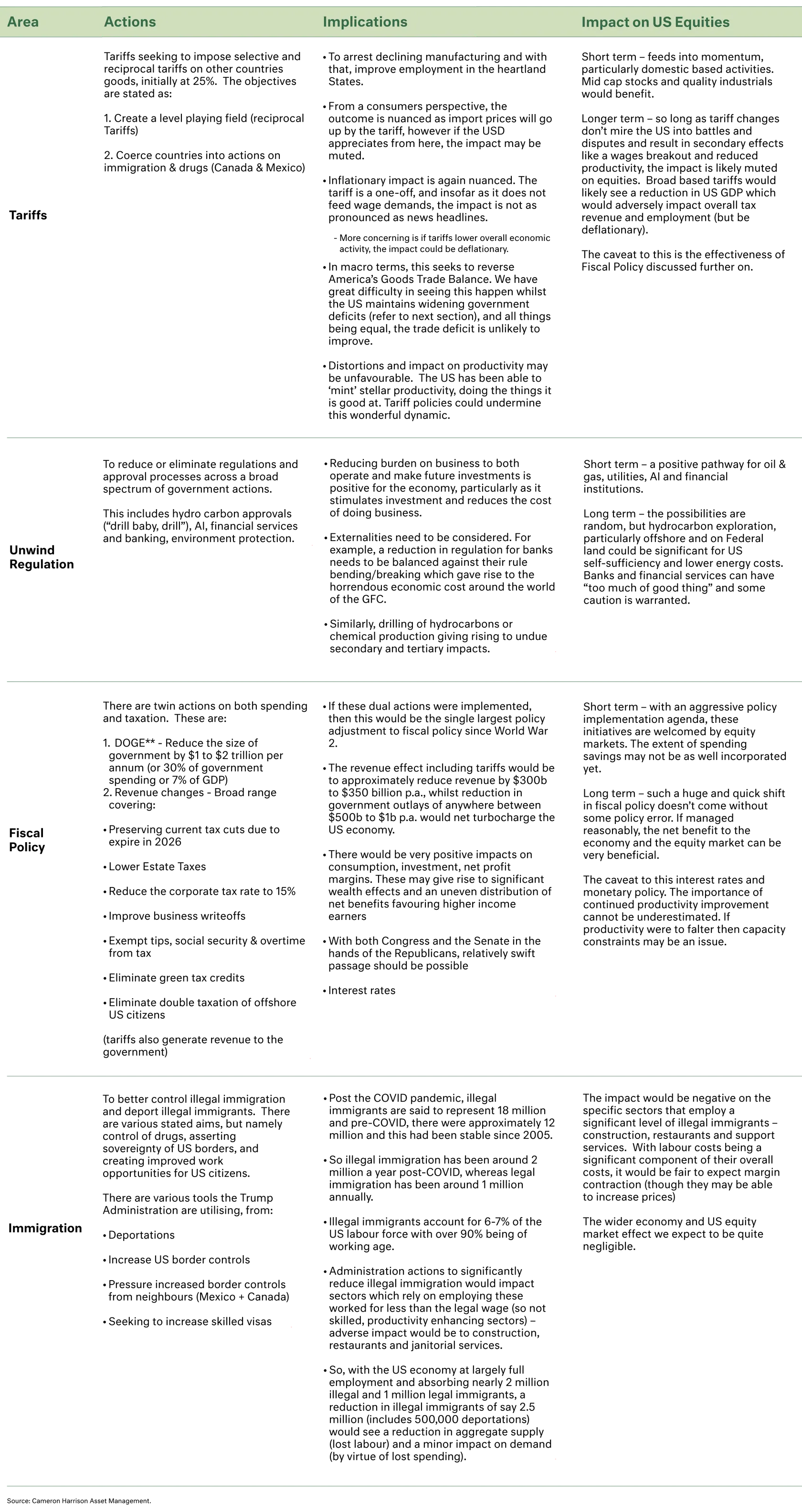 US Presidents are famous for their first 100 days and creating a momentum that will take them through the mid-term elections (in 2 years time) and then onto seeking a second term re-election. The Trump presidency is vastly different, because whilst a new president, there is no next term, having already served a term between 2016-2020. In legacy building terms, time is therefore of the essence, and this president is wasting no time. This begs the obvious. If the US economy is in such good shape, what are the implications of Trump’s economic policy on US equity markets? We think looking past the headlines and carefully examining, it is quite positive. That said, we do have significant reservations on the current level of equity market valuation, which to be fair, was present before Trump was elected. Trump’s policies as we now see them being implemented can grow the US economy and deliver significant wealth effect benefits. Our major reservation is the extent of economic policy change and business and households ability to absorb this generational change. (note – our analysis is only focused on the economic benefit, cost and flow-on effects to US equities)