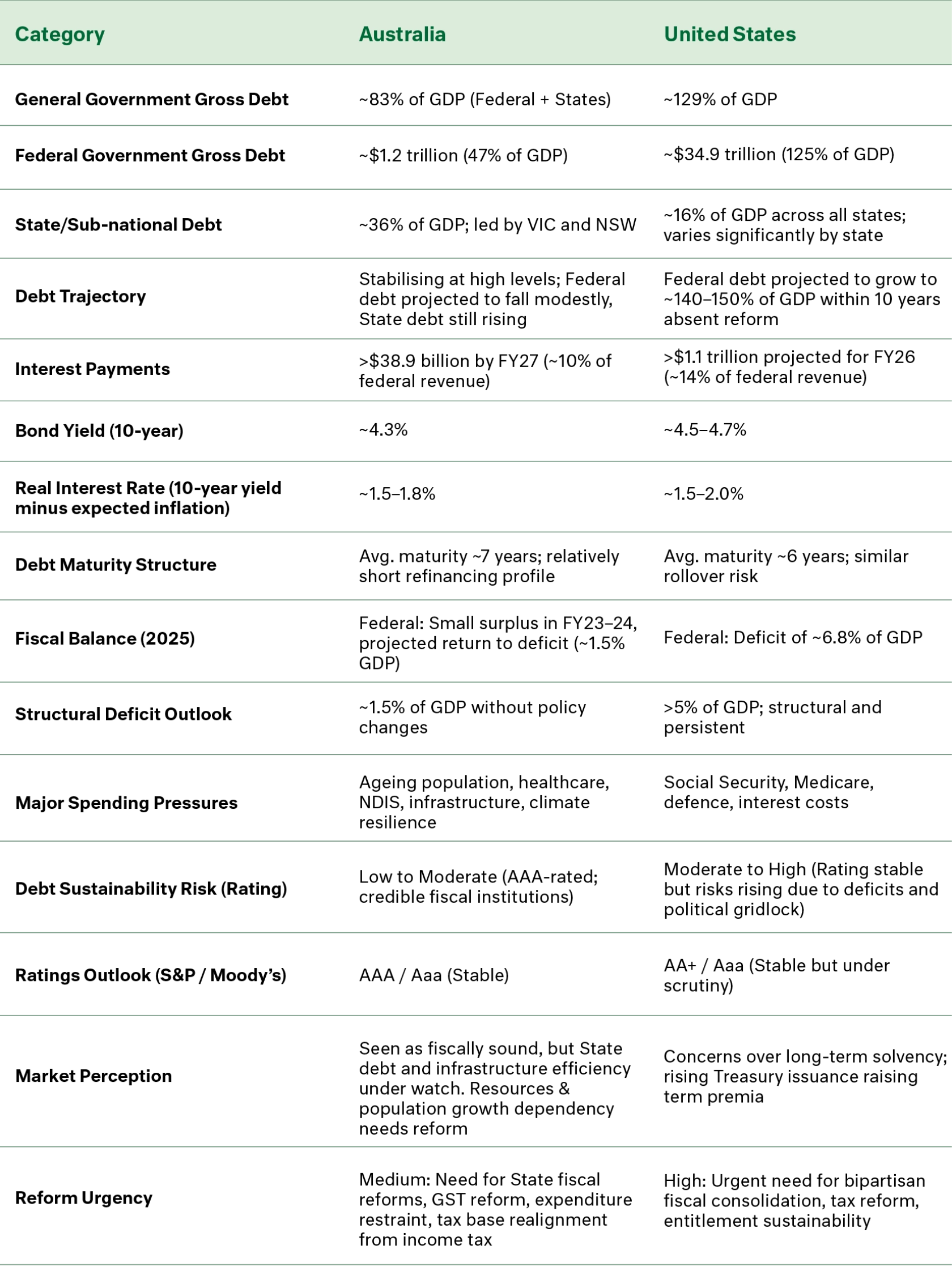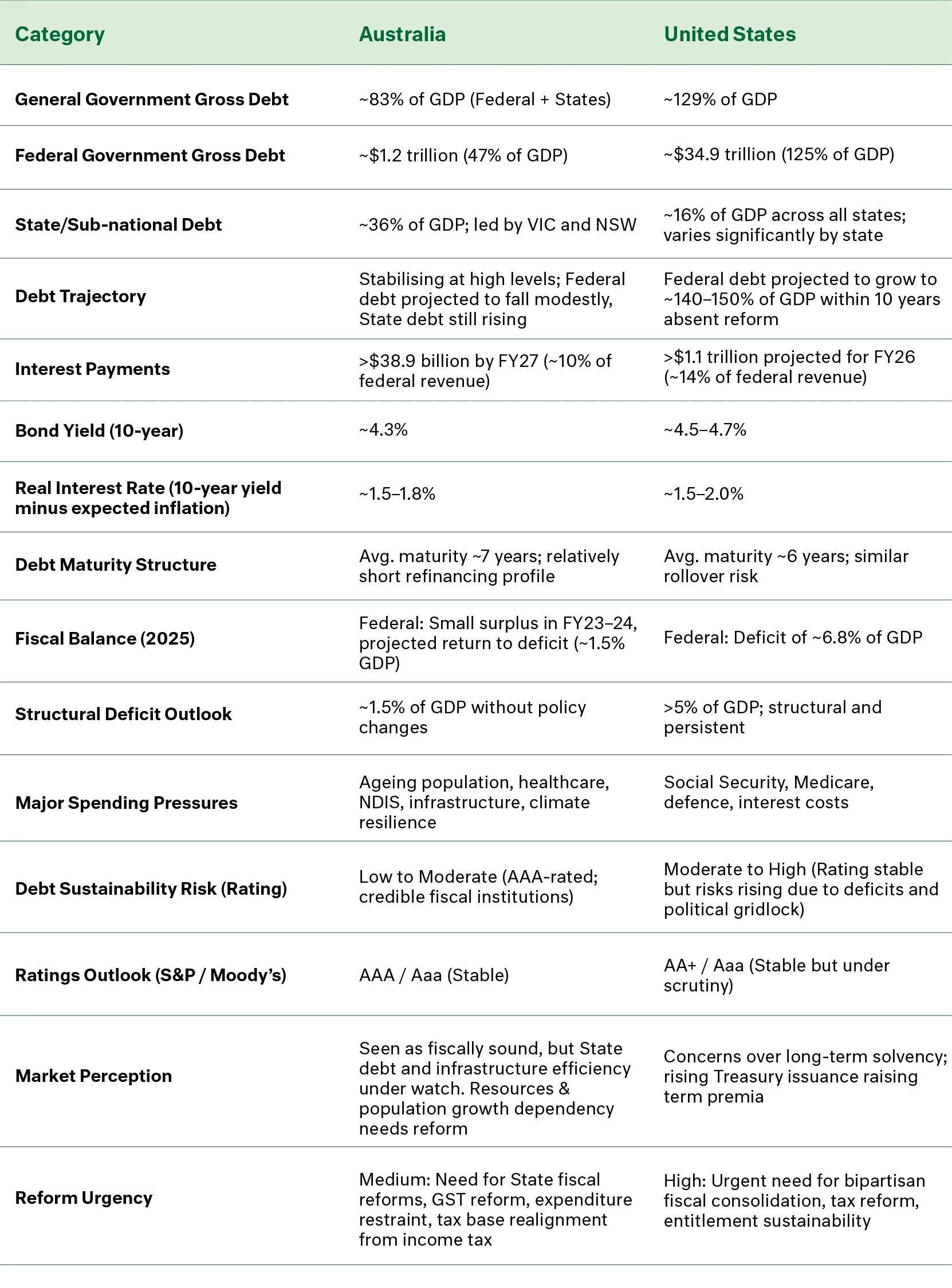 Australia’s gross public sector debt (including state debt) is expected to exceed 83% of GDP in 2025 - up from 41% pre-COVID. In the United States, debt is projected to reach 129% of GDP by 2025, with forecasts indicating 140–150% within a decade without substantial reform.