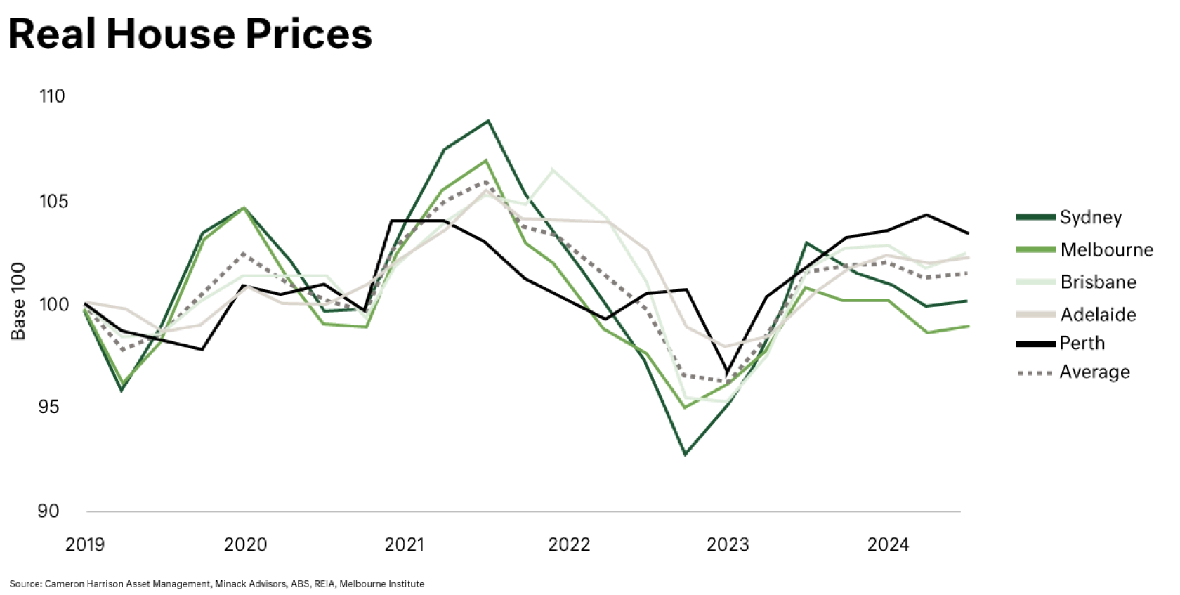 Australia’s housing market faces a tug-of-war between upward pressures driven by high immigration and constrained supply, and downward forces from stagnant (real) wages growth, tight lending conditions (for first home buyers/young family upgraders), a weakening set of dynamics for investment property (compounded by increased holding cost in State land taxes), and recent uncertainty surrounding Treasury reviews into negative gearing and the CGT discount. While the RBA’s pause on interest rates offers temporary relief, the true impact on house prices remains uncertain, with any future rate cuts likely to provide only modest support to a market contending with affordability constraints. As such, the near-term outlook points to flat or marginally declining real prices, with any significant recovery hinging on broader economic improvements and a more accommodative monetary environment in 2025.
