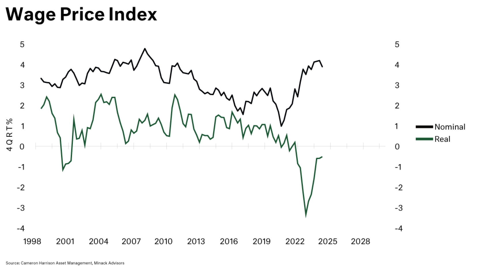 Large inflows of workers from the aforementioned immigration policy causes businesses to have a larger pool of workers to fill jobs from; this moderates wages. Real wages are further dampened by the ‘sticky’ inflation experienced recently, as any annual pay increases have their increased purchasing power eroded away by inflation (and tax ‘bracket-creep’), leading to negative real wage growth (see below chart).